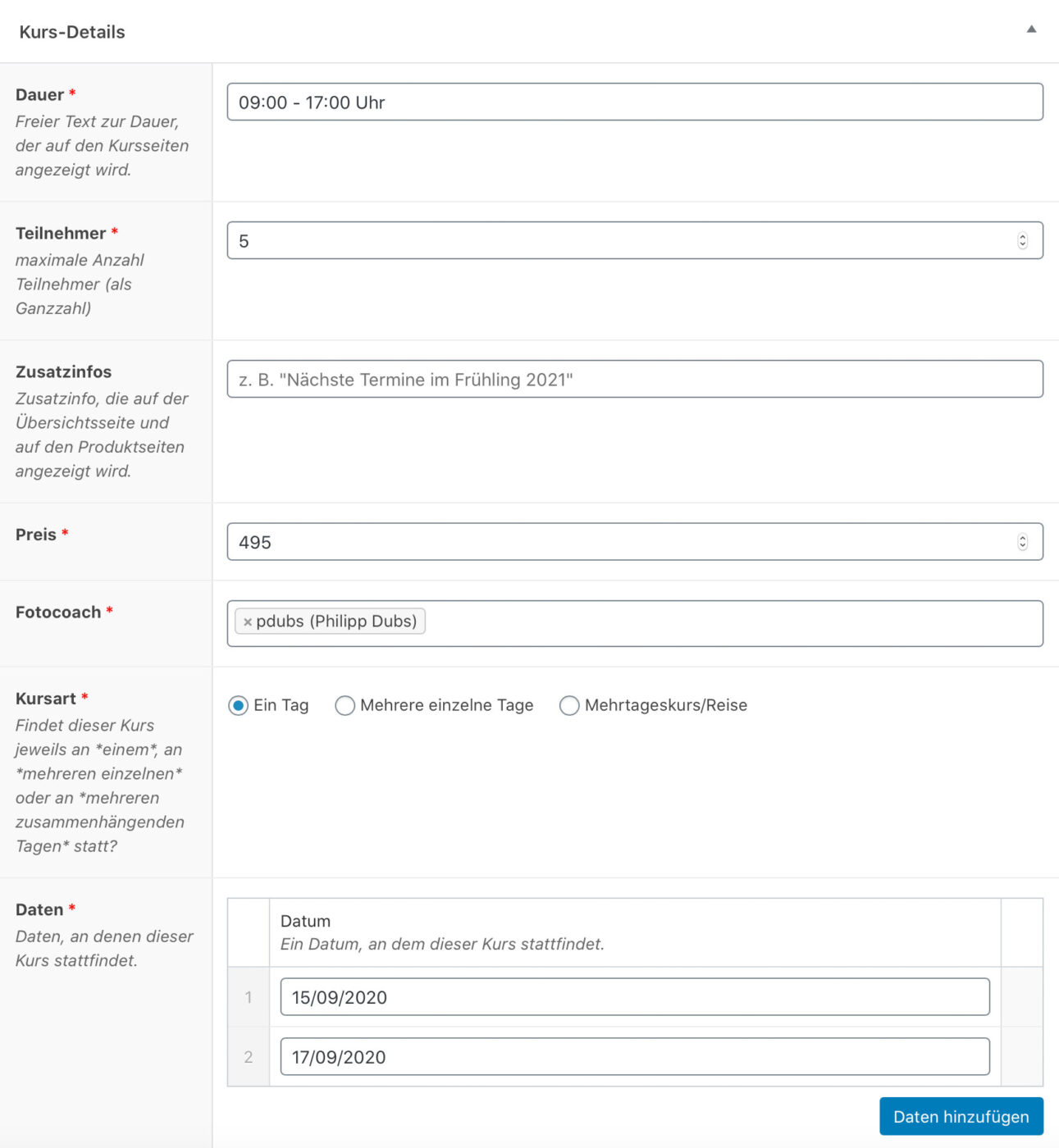 Wir nutzten Advanced Custom Fields Pro, um für den Kunden eine sehr einfache Oberfläche zu erstellen, über die Kursdaten eingetragen werden. Im Hintergrund entwickelten wir ein Script, welches bei jedem Speichern des Produktes die Daten aus ACF mit den WooCommerce-Variationen synchronisiert, so dass der Kunde diese nicht mehr direkt bearbeiten muss.