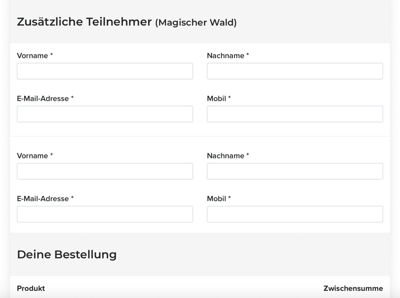 Für die Standardfelder des WooCommerce-Checkouts veränderten wir zunächst die Reihenfolge und erweiterten dasFormular um einige zusätzliche Felder, die dem Kunden bei der Bestellung abgefragt werden sollen. Wenn ein Kurs von einem Kunden mehr als einmal gebucht wird, werden zudem automatisch alle Teilnehmerdaten wie Vorname, Nachname etc. für den zusätzlichen Teilnehmer abgefragt.