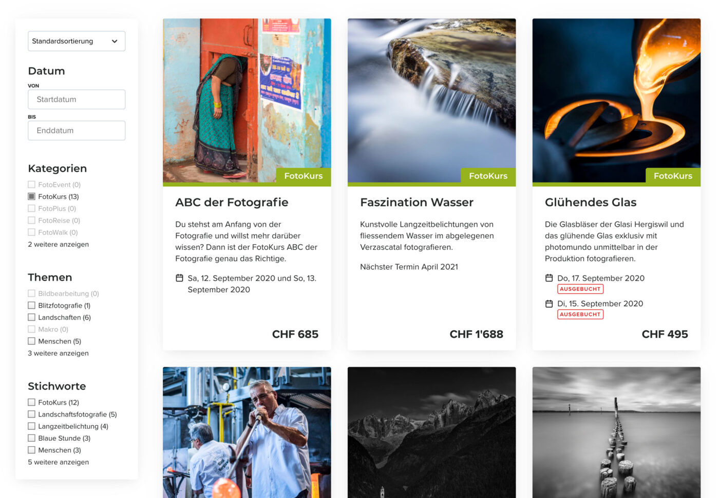Diese lässt eine Filterung aufgrund der Kategorien, Themen oder Stichworten zu. Zudem können die FotoKurse und -Reisen nach Datum gefiltert werden.