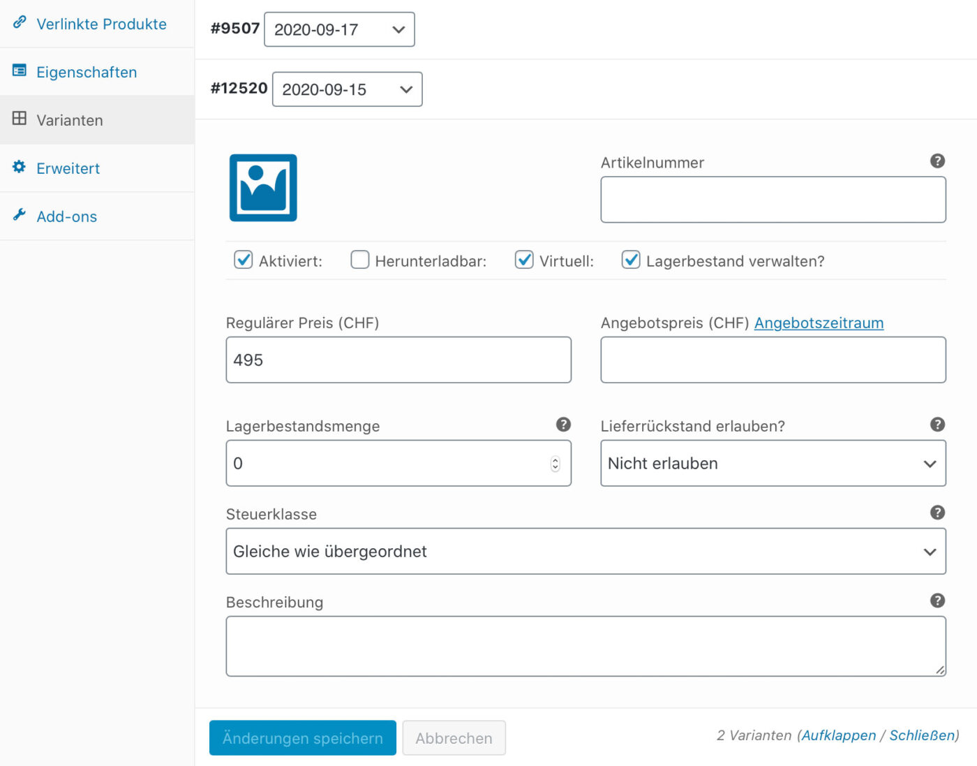 WooCommerce bietet bereits “out-of-the-box” die nötigen Funktionalitäten, um Varianten eines Produktes (sog. Product Variations) anzulegen. Dies ist ein mächtiges Tool, erwies sich aber für einfachere Varianten in der Pflege etwas umständlich.