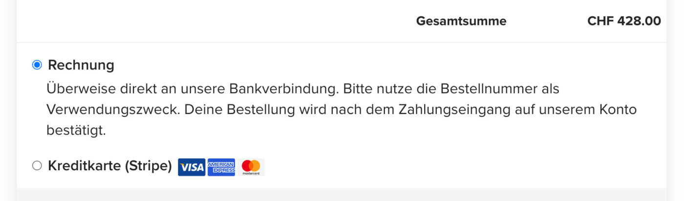 photomundo bietet neben Fotokursen und -Reisen, die einen oder mehrere Tage dauern, auch kurze und günstigere Abend-Workshops an. Da sich für diese eine Rechnung kaum lohnt, sollte bei diesen Produkten nur die Kreditkartenzahlung angeboten ewrden. Hier nutzen wir (ebenfalls über das oben genannte Interface) Checkboxes im Backend, mit denen Zahlungsart komfortabel gesteuert werden kann.